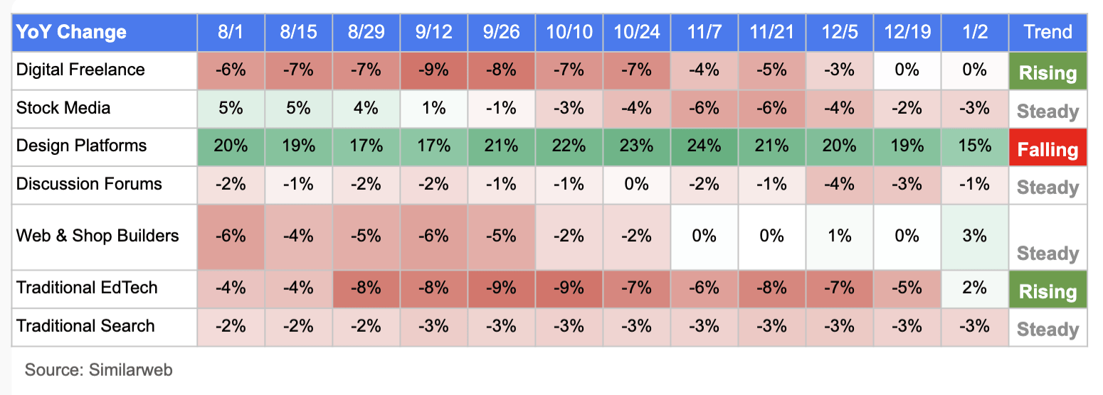 展示韧性/苏醒:搜刮引擎(全体不变)、网坐搭建(转正增加)、设想平台(仍连结较高增加)。内部合作激烈。以及次要玩家的表示环境。合作红海/增加乏力赛道:通用AI、图像生成、写做东西、从动化东西增加放缓或下滑,对演讲中涵盖的生成式AI东西赛道及其受影响的保守行业进行总结,