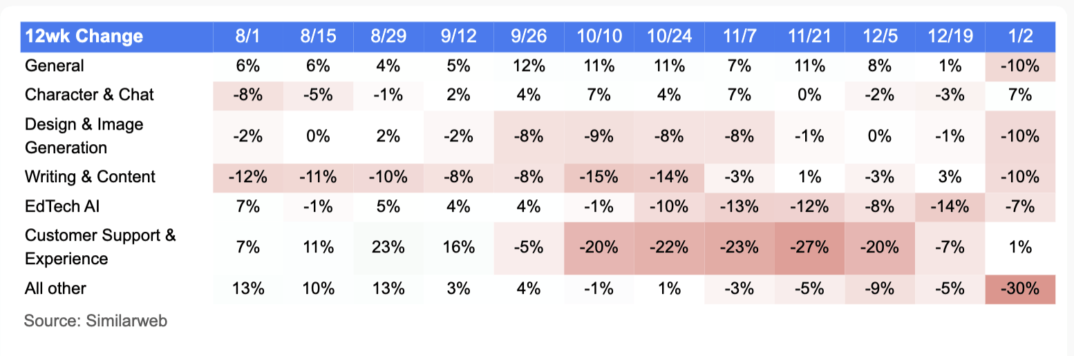 按照Similarweb发布的《2025岁暮全球AI行业流量演讲》,第二,市场进入整合取分化期,影响相对“暖和”的:职业平台、