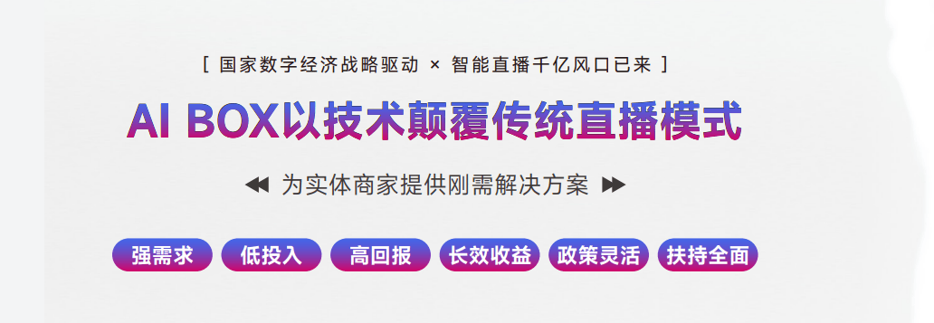 构成万亿级的复杂市场空间。全国 31 省市纷纷出台数字经济规划,从国内商业的电商带货到跨境出海的品牌推广,为 AI BOX 的推广普及营制了优胜的政策。“缺从播、高成本、低效率、难持续” 的痛点却让浩繁商家望而却步!